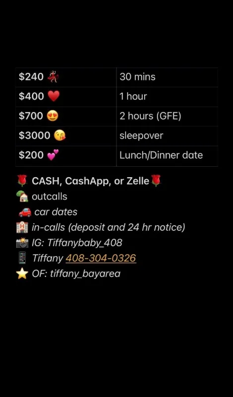 hiii my loves! vietnamese american. 5'4", 160lbs, big DD cups ♥ highly reviewed and recommended, find my reviews... same name and number xoxo 😚 Clean, Discreet, and very Sweet 🍒 I specialize in hotel Incalls, Outcalls & Car Dates—I come to you for a discrete, high-end experience that’s never rushed! 🏨✨ ✨ Why Pick Me ✨ • 🇰🇷/🇨🇳 Stunning Asian Beauty • 🍈🍈 Double DDs • ⏳ Curvy, thick Vietnamese • ⚡ Same-Day Appointments Available! • 🤫 100% Discrete & Professional 💎 Rates 💎 • ⏱ 30 Mins (HH): $240 • ⏱ 60 Mins (HR): $400 ❌ I DO NOT OFFER QV ❌ 💋 📲 Tiffany... text only!! ... TEXT ME YOUR AGE, RACE, and LOCATION FOR A REPLY!!! 👀 even better in person 🙂 If you cannot read my ad fully, I will block your number. cash, cashapp, or zelle ok outcalls, car dates, available in San Jose